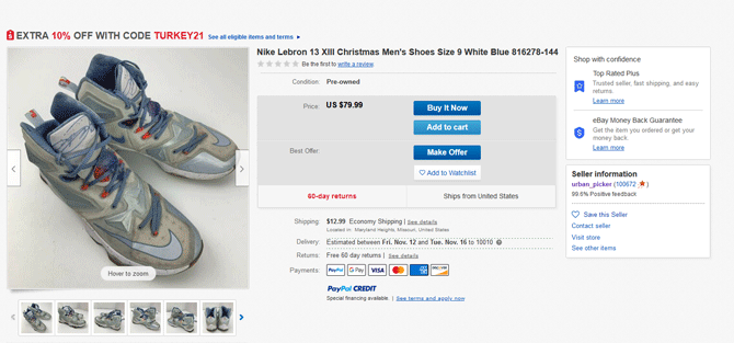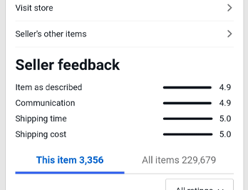 در صفحه محصول در سایت ایبی در قسمت راست پایین میتوانید میزان آراء مثبت فروشنده و نام فروشنده را مشاهده کنید. برای اطلاعات بیشتر میتوانید روی نام فروشنده کلیک کنید.